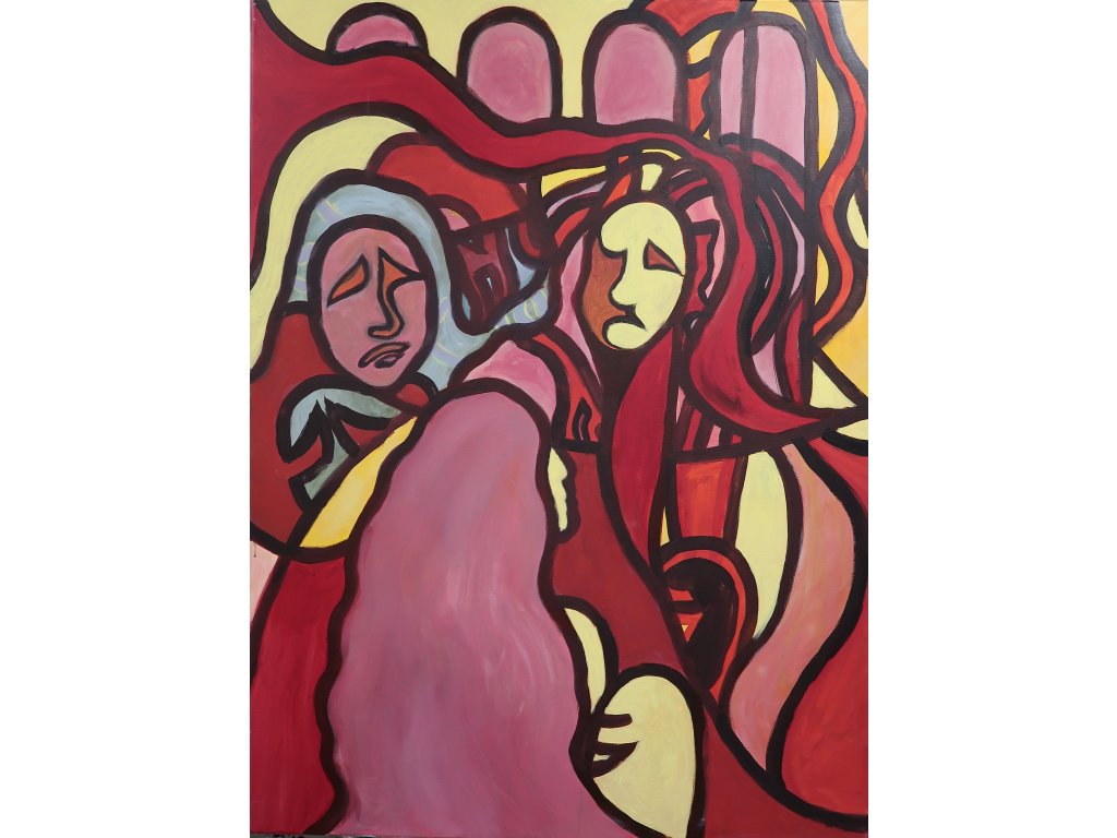 Barbora Prošková: "Zmatení jazyků" (2. roč) - klauzurní práce červen 2025 "Biblická témata", FIGURÁLNÍ KOMPOZICE vedení MgA. Tereza Laznová, v 120, š 90, akryl na plátně - SUPŠ Zámeček